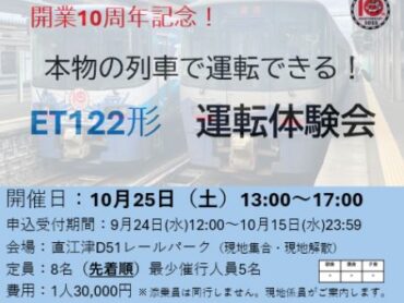 えちごトキめき鉄道の列車の運転が体験できる催し「ET122形運転体験会」が10月25日(土)に開催されます。予約受付が9月24日(水)正午から始まっています。 …