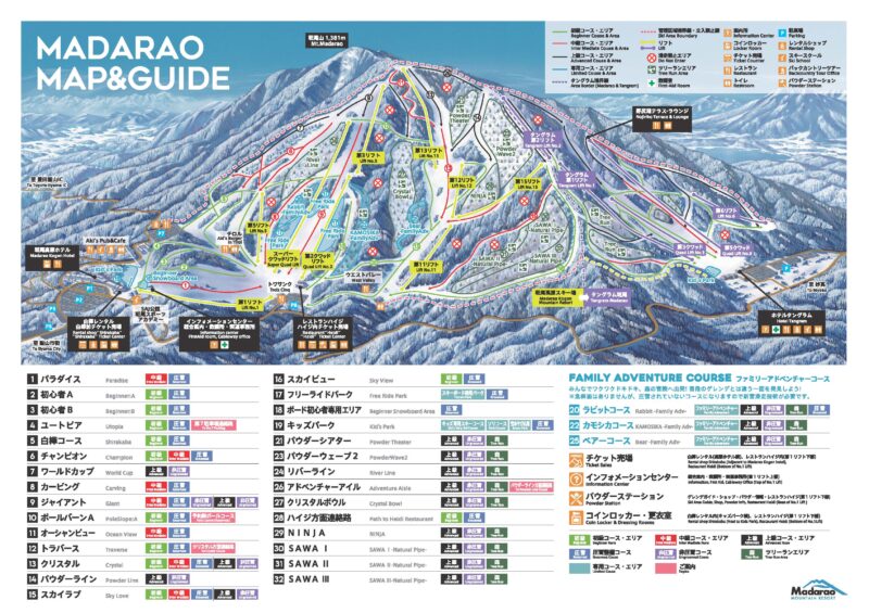 地図の右側、タングラムスキーサーカスともつながっていて、マウンテンパス(共通リフト券)を購入すれば、2つのスキー場で滑りを楽しむことができます。タングラムスキーサーカスと併せて全51のバリエーション豊かなコースレイアウトが楽しめます。
