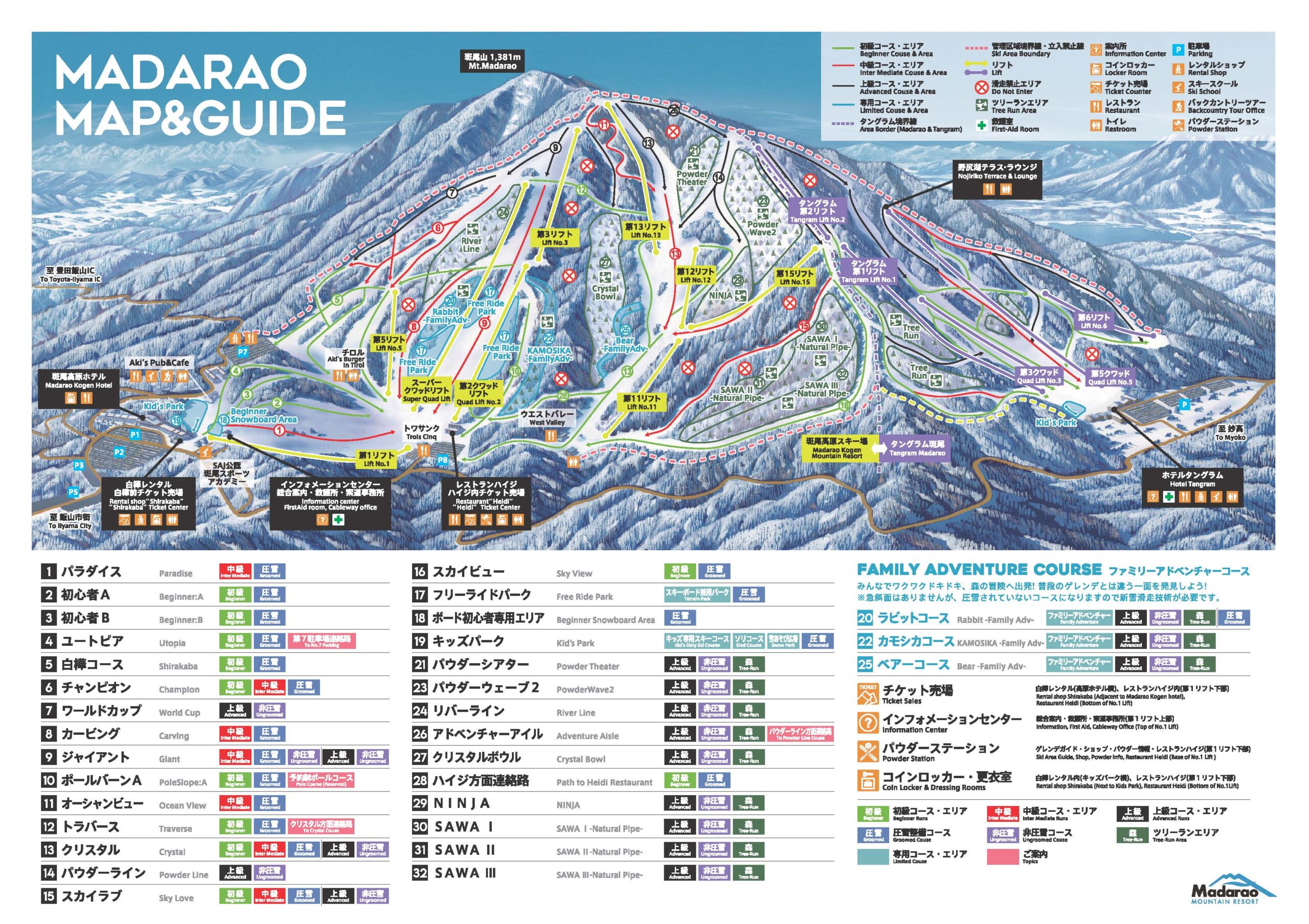 100%天然雪の豊富な積雪と上質なパウダースノーが特徴です。バリエーション豊かな32コースは日本最大規模を誇り、初心者やファミリーはもちろん、中・上級者にとっても滑り応え十分です。自然そのままに限りなく近い森の中を滑るツリーランコースも15コースあり、コース数は日本最大級を誇ります。(初級30% 中級35% 上級35%)。
