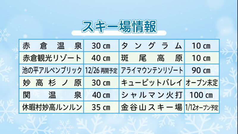 上越妙高エリアの各スキー場の積雪は下記の通り(12月25日 午前 現在)