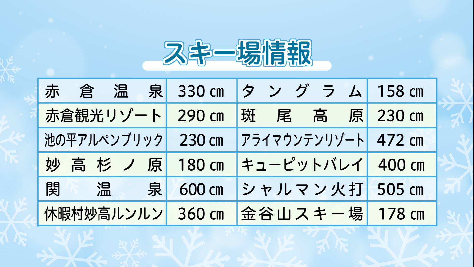 上越妙高エリアの各スキー場の積雪は下記の通り(2月4日 午前 現在)