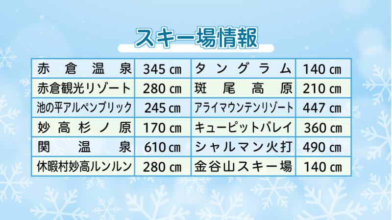 上越妙高エリアの各スキー場の積雪は下記の通り(2月20日 午前 現在)