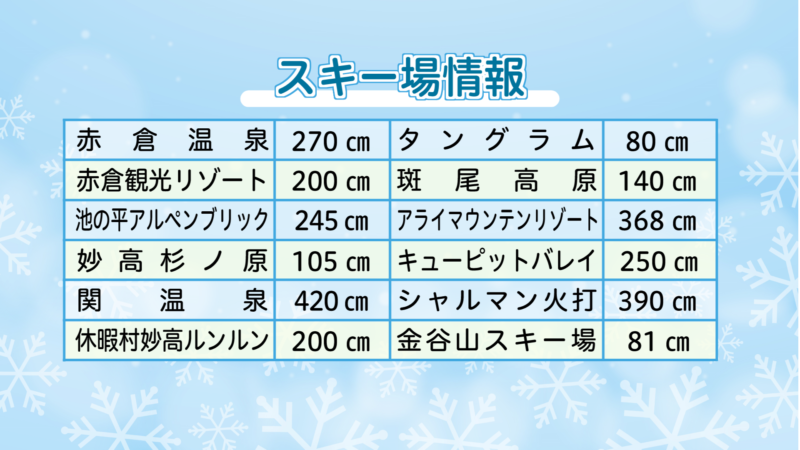 上越妙高エリアの各スキー場の積雪は下記の通り(3月4日 午前 現在)
