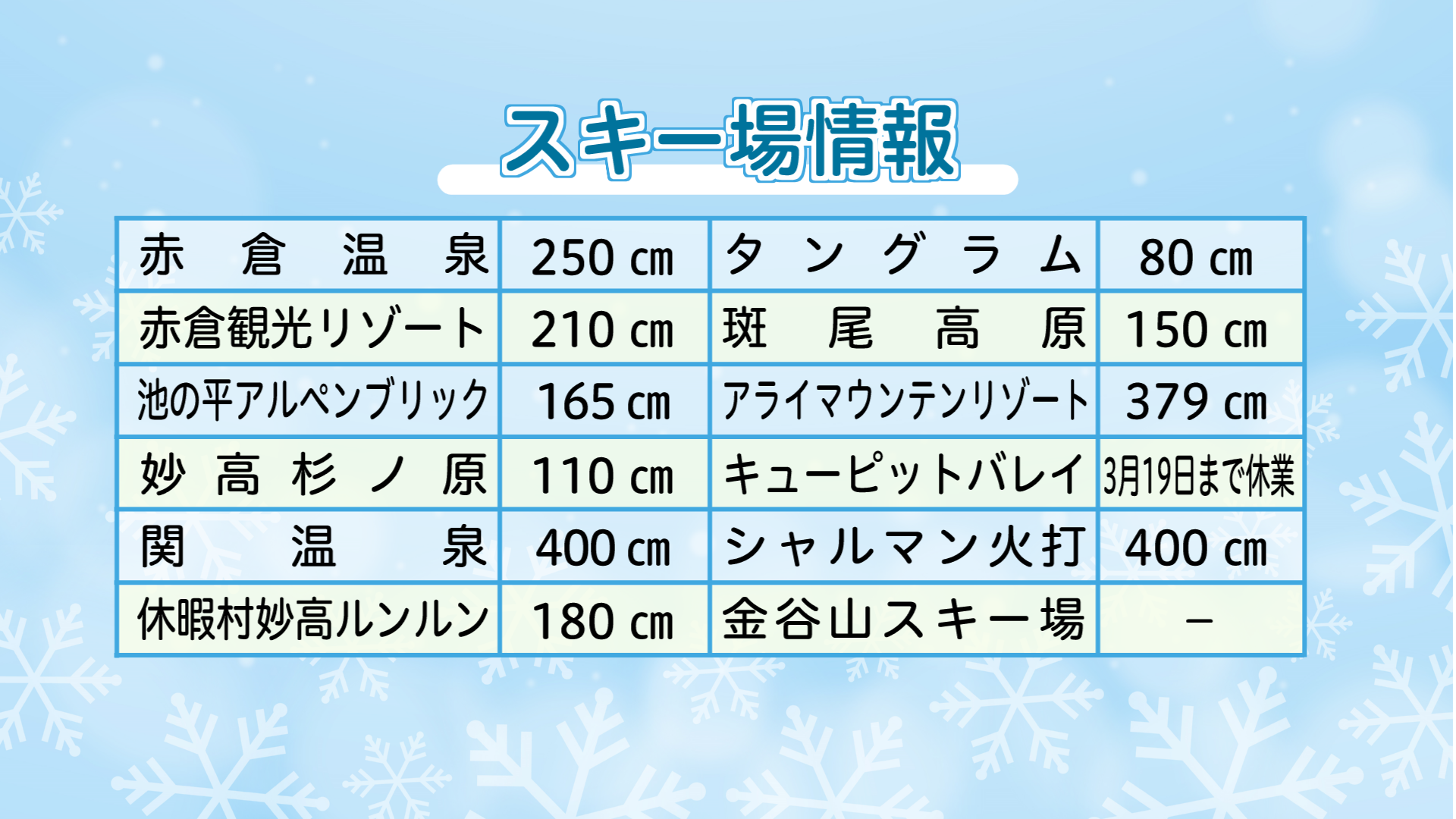 上越妙高エリアの各スキー場の積雪は下記の通り(3月16日 午前 現在)