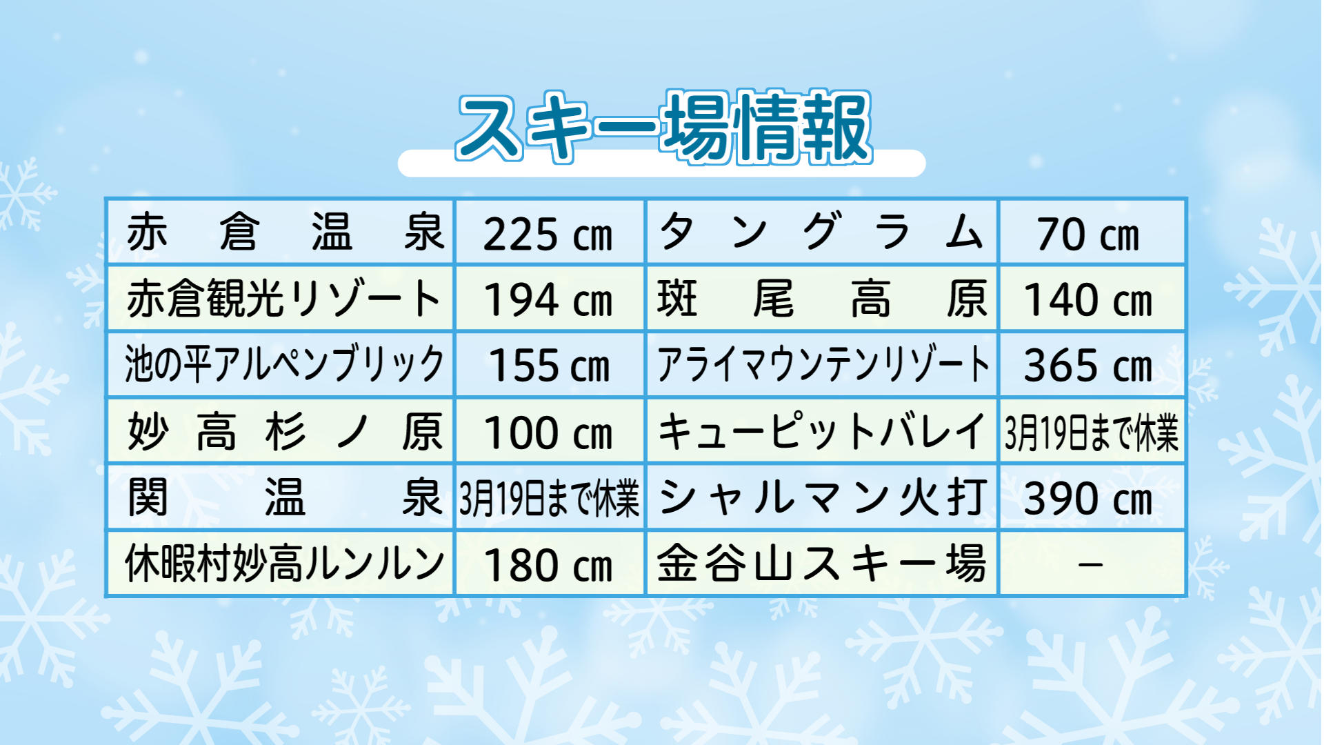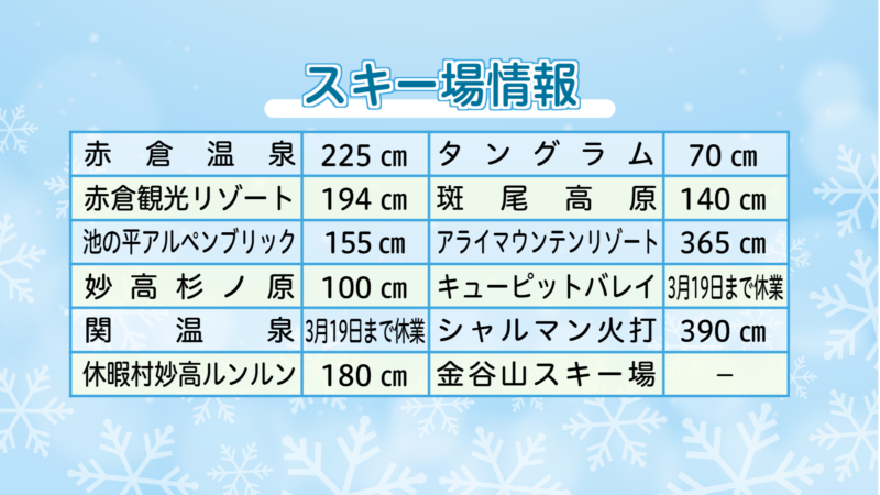 上越妙高エリアの各スキー場の積雪は下記の通り(3月19日 午前 現在)