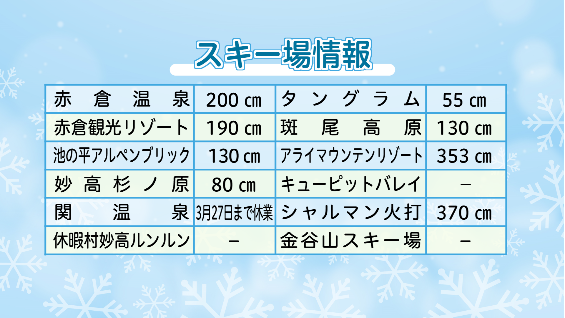 上越妙高エリアの各スキー場の積雪は下記の通り(3月24日 午前 現在)