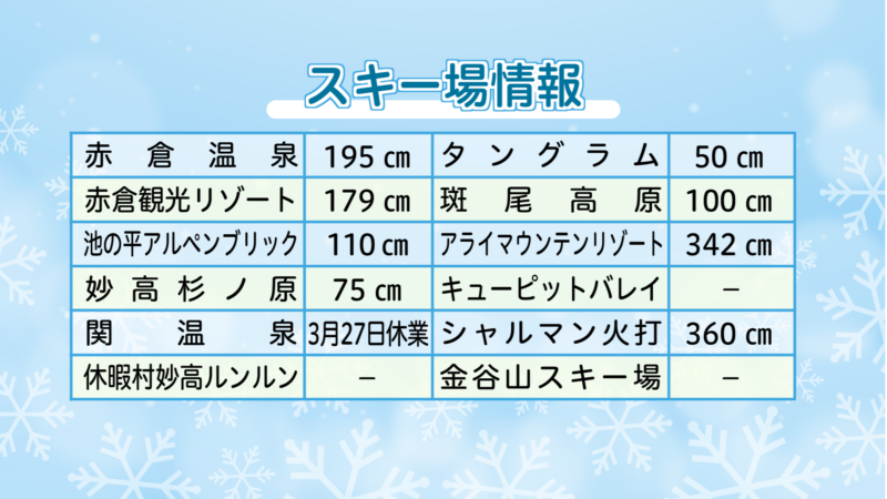 3. 上越妙高周辺スキー場 積雪情報(3月27日午前 現在)