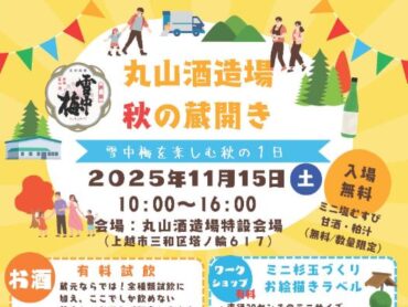 新潟県上越市三和区の酒蔵「丸山酒造場」の全銘柄や、普段飲めない珍しい日本酒の試飲をはじめ、工場見学やワークショップなどが楽しめるイベント「秋の蔵開き」が11月1…