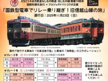 えちごトキめき鉄道(新潟県)と北しなの線(長野県)の開業10周年を記念し、国鉄形観光急行とプロジェクト115のコラボ企画「国鉄型電車でリレー乗り継ぎ!旧信越山線…